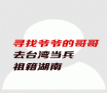 详情 被寻找人是我爷爷的大哥,叫熊小云,我爷爷叫郭连章,我爷爷是被接到他舅舅家的,所以姓郭,我奶奶叫张银针,95年去世了,一直想寻找到大爷爷,听奶奶讲大爷爷是被抓壮丁当兵去了台湾,解放后大爷爷还来过一封信,当时奶奶不认识字,又听说部队当兵的信不能乱拆,所以又被退回去了,至今就没有音信了,我的爸爸叫郭维均,12年已经过世了,只剩妈妈健在了,不知大爷爷的后代是否知道大陆湖南还有他的亲人在寻找他们,但愿能如愿以偿!保佑!!!